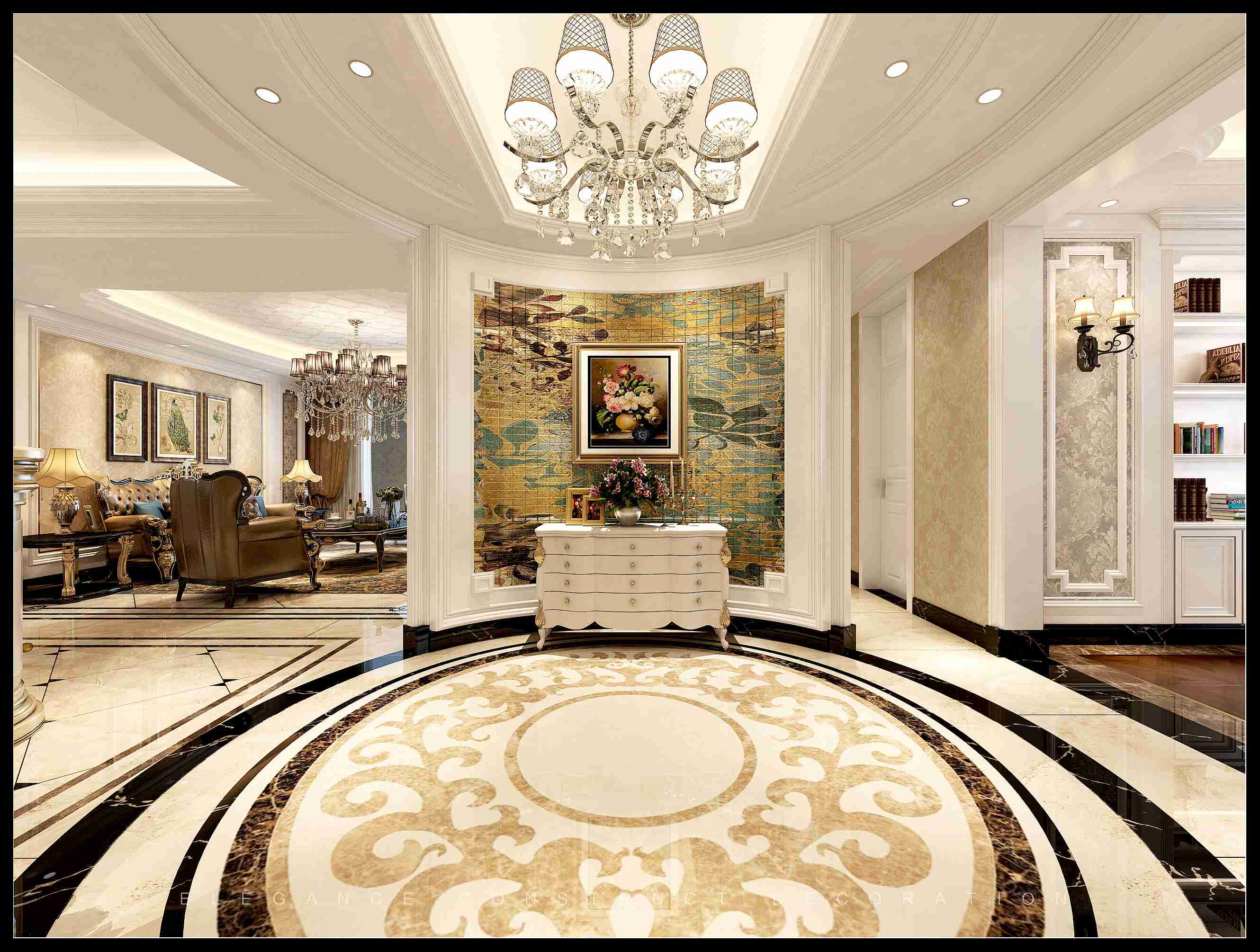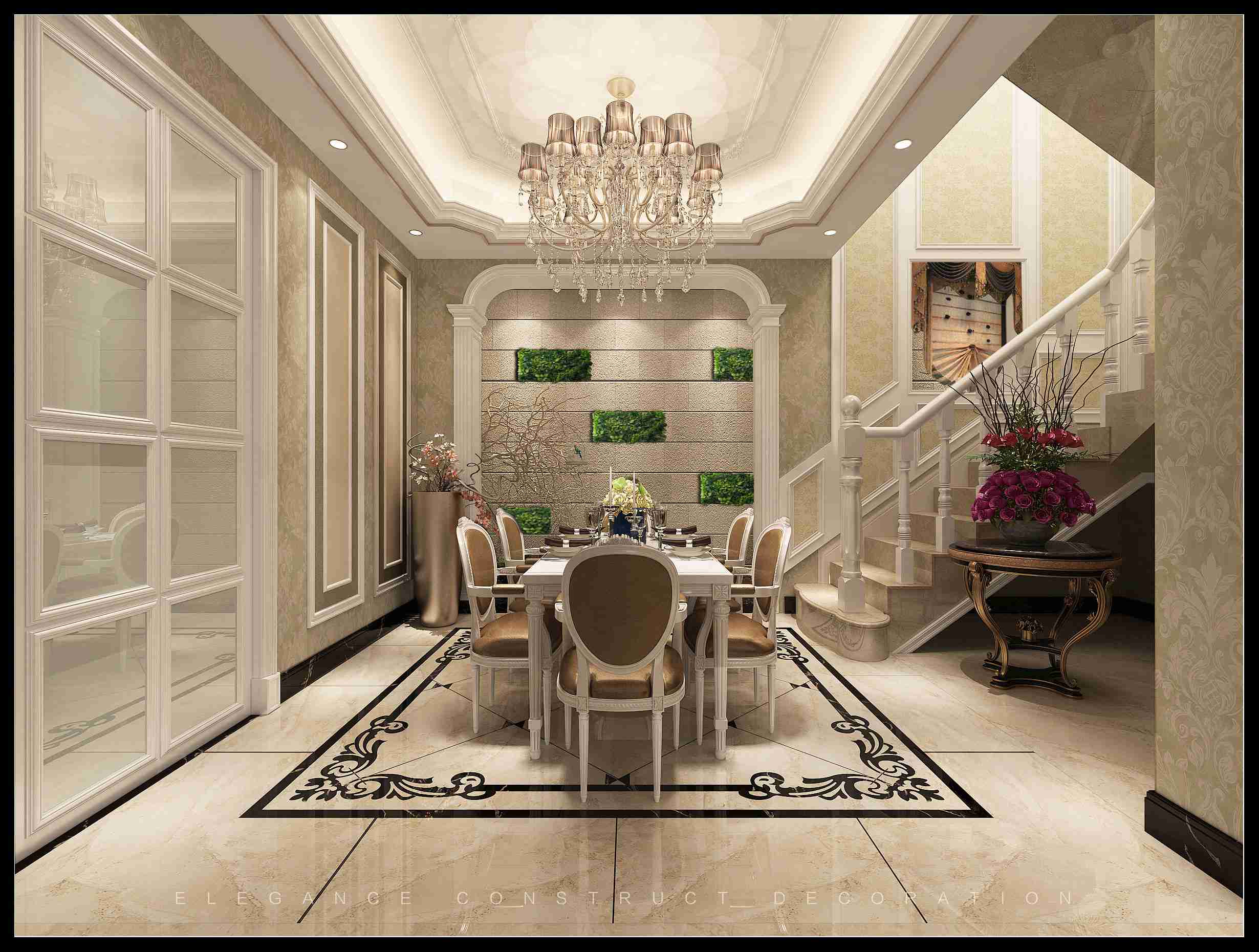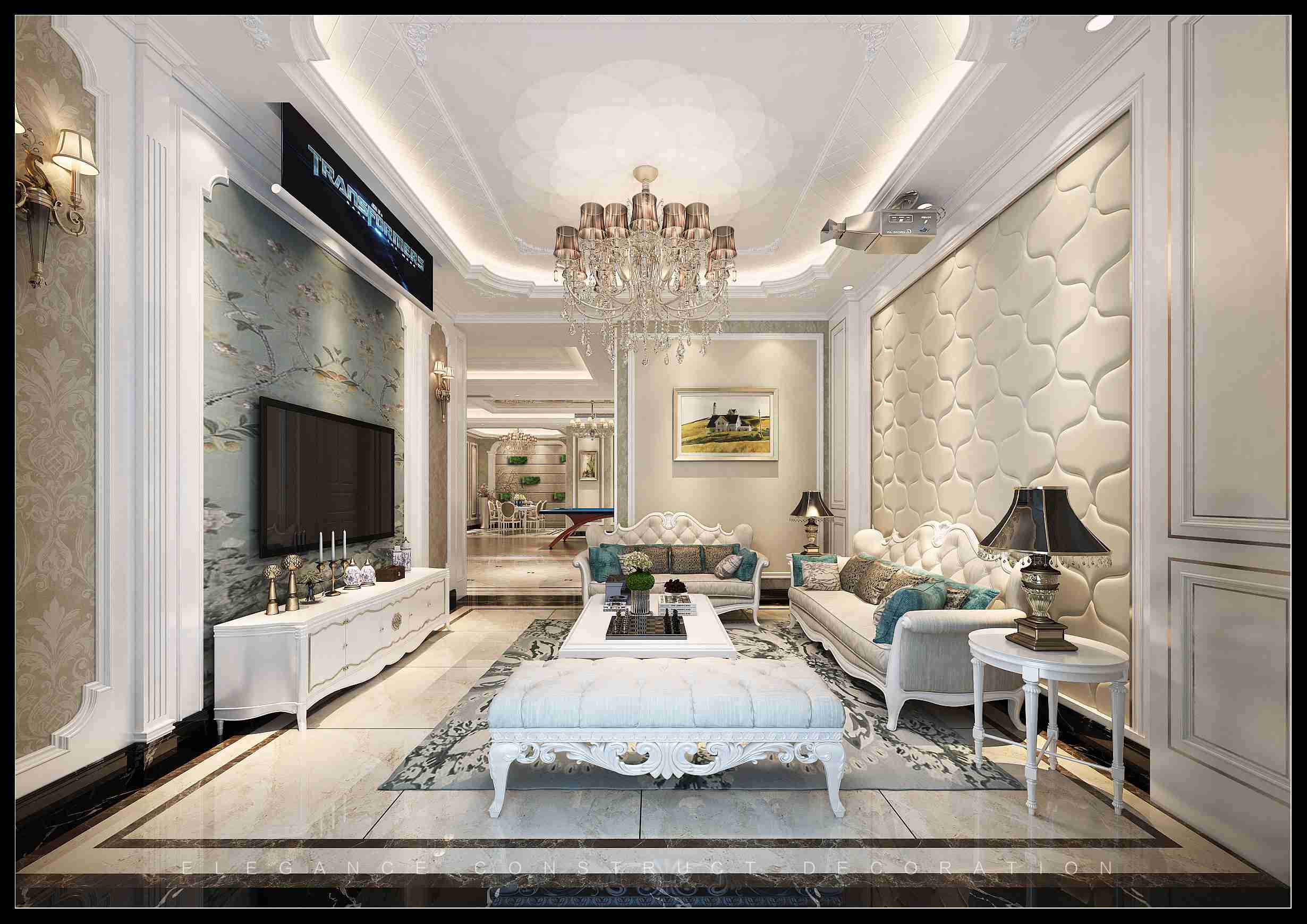 客廳精簡(jiǎn)的線條,飽含奢華感,通過異材質(zhì)的搭配,石材和壁紙材料恰到好處的結(jié)合,讓客廳變得奢華美好,創(chuàng)造出一種更具浪漫、動(dòng)感而又華麗纖細(xì)的裝飾格局。地毯圖案顏色相互融合,點(diǎn)綴了空間又不顯突兀。