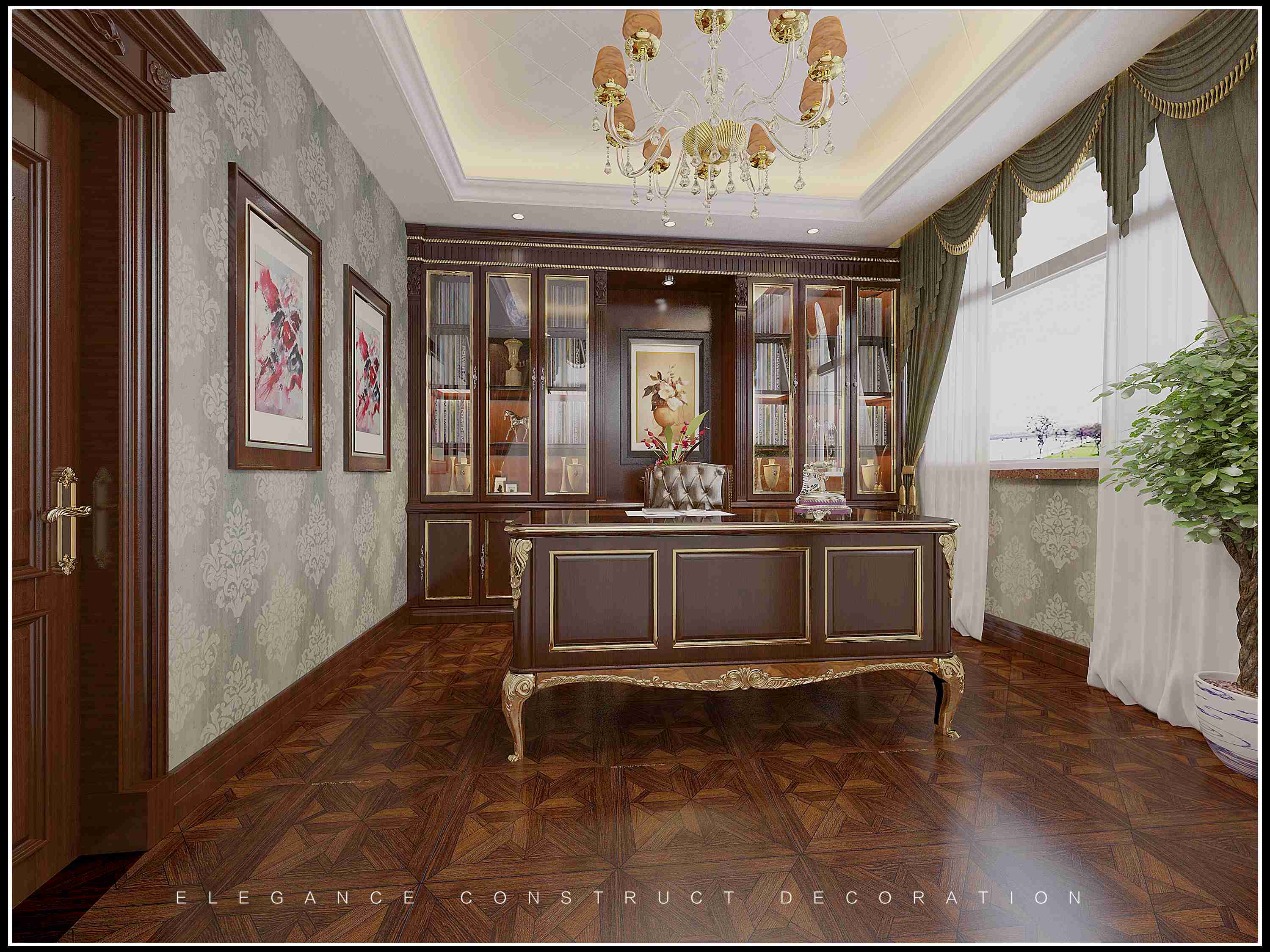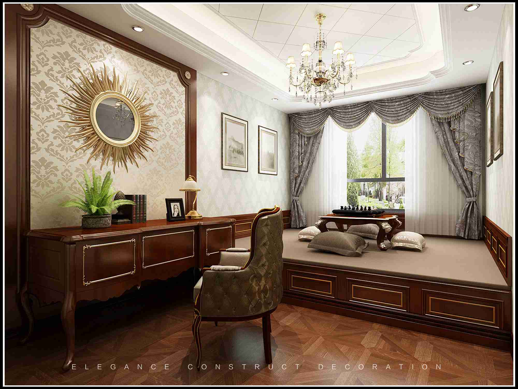 這里是傳統(tǒng)歐式書房,木質(zhì)家具的設(shè)計(jì)讓書房空間顯得十分莊重,同時(shí)書柜的設(shè)計(jì),也體現(xiàn)出空間濃厚的文化氛圍,凸顯出空間主人濃厚的文化底蘊(yùn)。