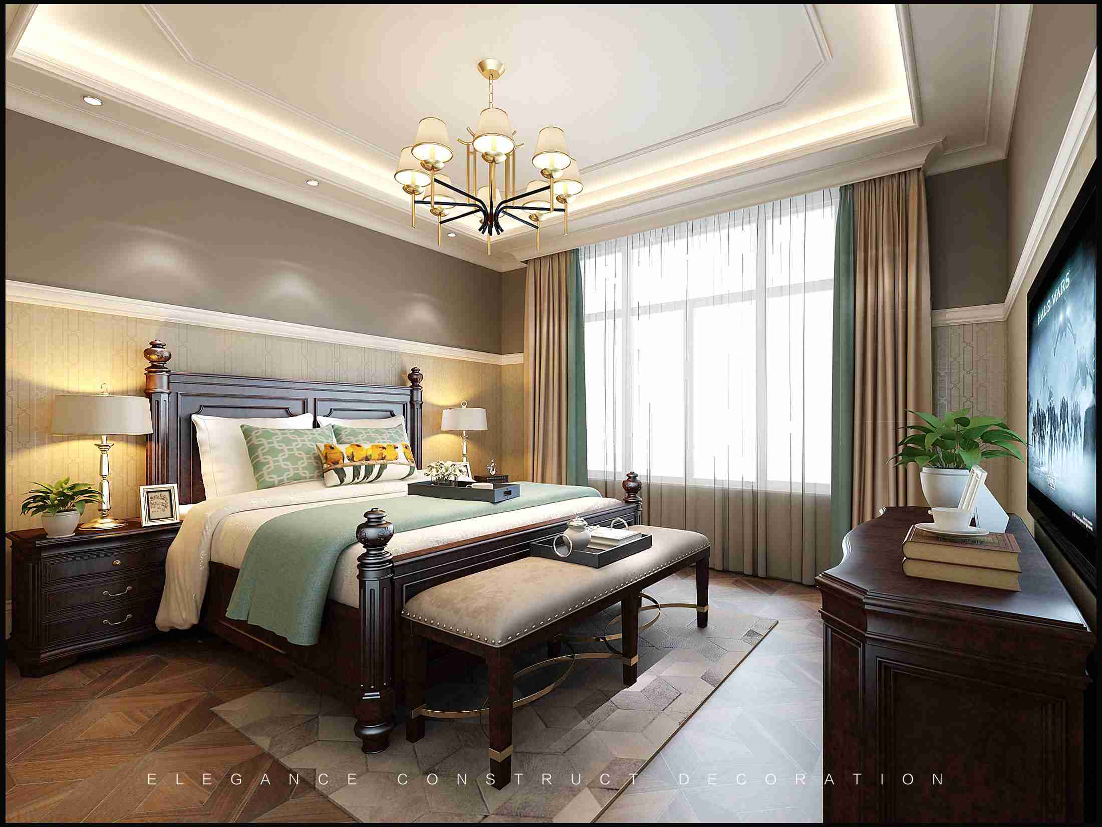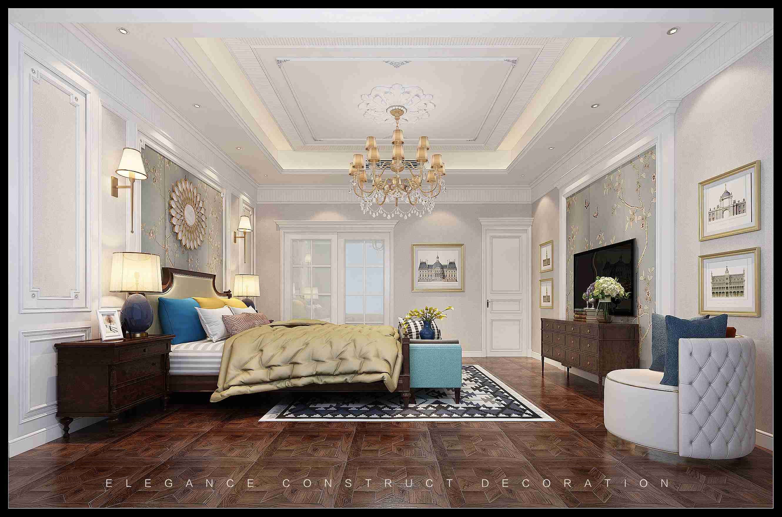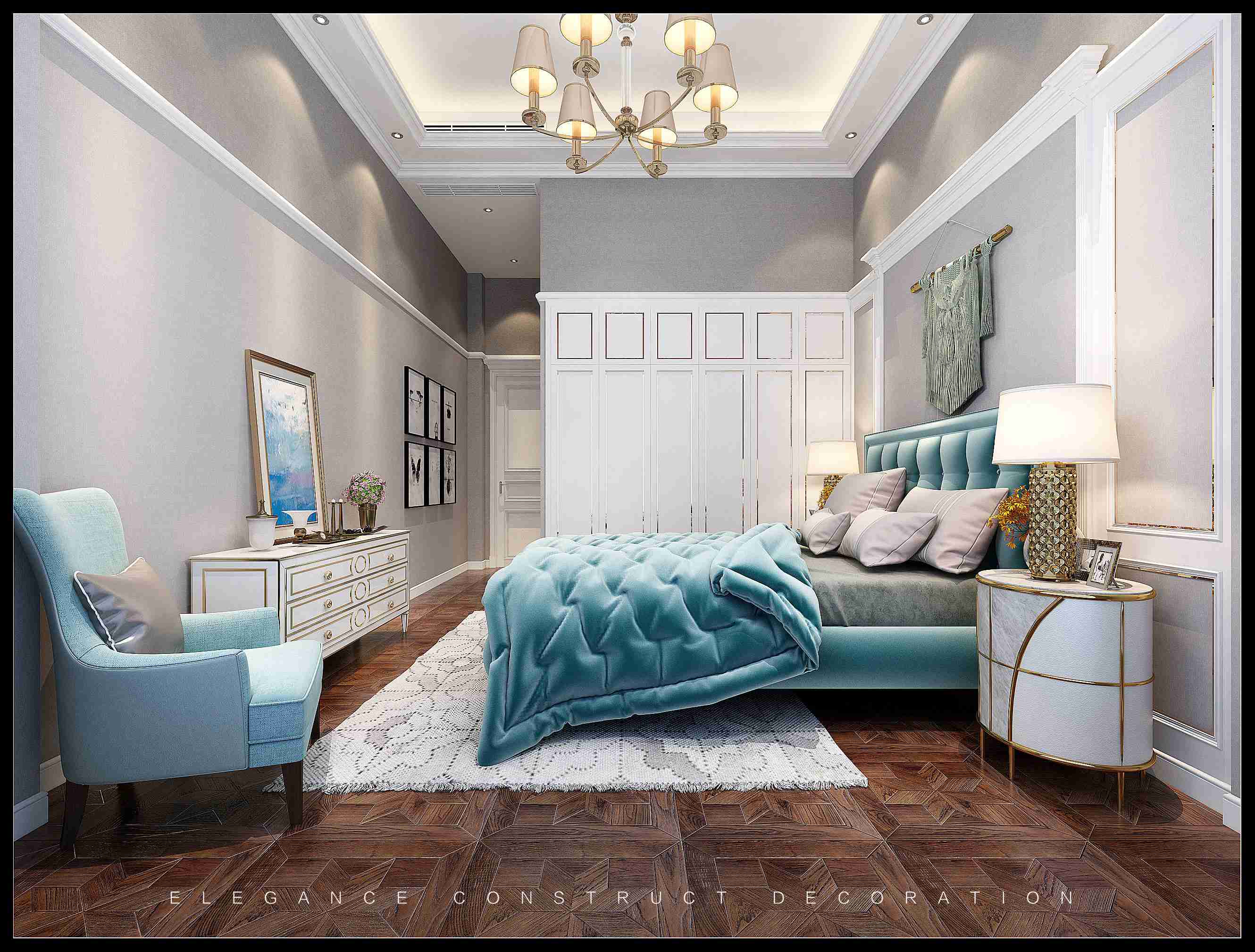 主臥室:整體空間色彩主要采用藍(lán)色與淺灰色,主要體現(xiàn)在背景墻、地面、窗簾等主要軟裝家具上,營造一種安逸舒適、優(yōu)雅氛圍,后加一點點暖黃色,將整個空間的色彩點亮,空間一下子就賦予了層次感,讓主人休息更貼心。