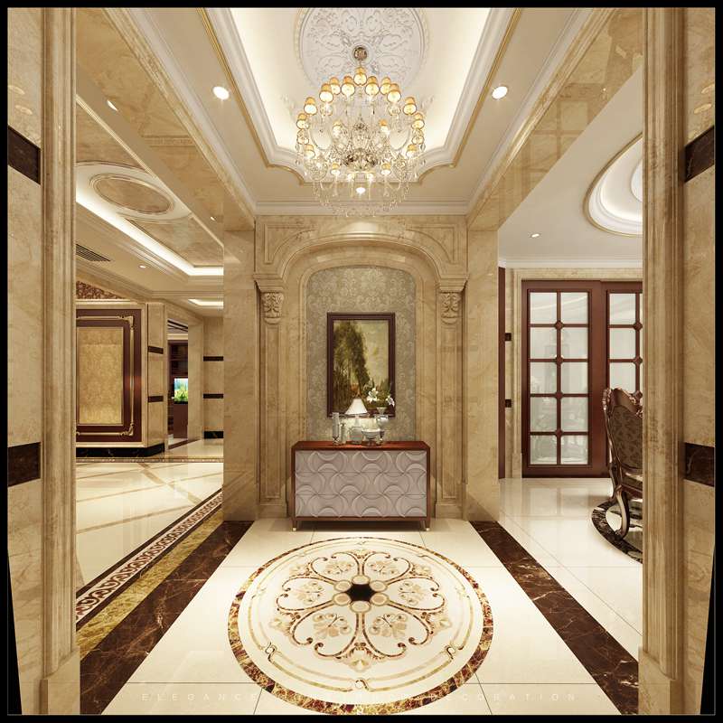 玄關(guān)采用簡(jiǎn)潔對(duì)稱貴氣的羅馬柱,地面上拼花和內(nèi)嵌的歐式花紋交相輝映,棕紅木邊的質(zhì)感玄關(guān)柜搭配精致的裝飾品,金色線條勾勒更精致了空間的內(nèi)容,搭配傳統(tǒng)的歐式奢華吊燈,玄關(guān)壁畫,彰顯歐式風(fēng)格強(qiáng)烈的尊貴感。