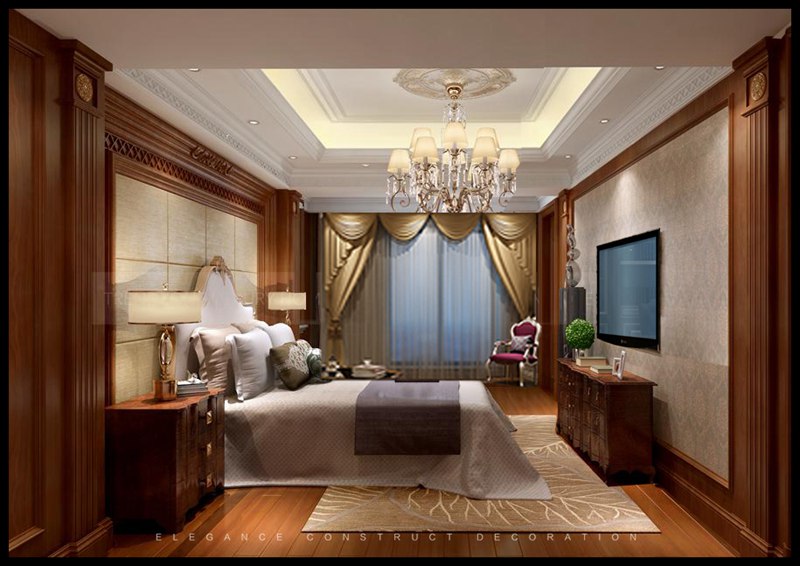 以米黃色和紅棕色為主色調(diào)的臥室,大氣沉穩(wěn)、舒適溫馨,經(jīng)典歐式背景墻與電視背景墻呼應(yīng),金色窗簾和歐式吊燈呼應(yīng)。彰顯出房主生活的品質(zhì)。