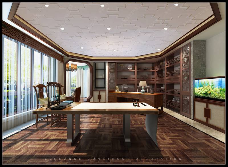 書房的木質(zhì)地板與吊頂呼應(yīng),作為一個(gè)工作學(xué)習(xí)的場(chǎng)所,這個(gè)空間本身功能上就相對(duì)嚴(yán)肅。搭配中式風(fēng)格的書桌、書架,整個(gè)空間更顯穩(wěn)重大氣,留有一隅空間可以直接享受午后暖陽,與友人一同在此品茶、暢談,實(shí)為一大樂事。
