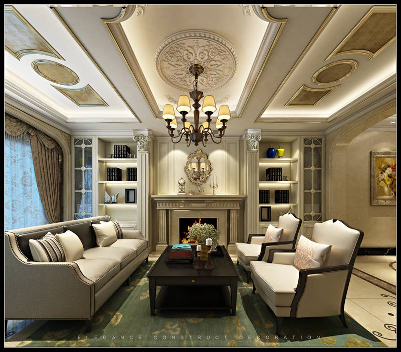 客廳以淡金色為主調(diào),舍棄傳統(tǒng)歐式的金黃色,整體效果相對(duì)于傳統(tǒng)歐式更加內(nèi)斂。圓形的吊頂設(shè)計(jì),搭配傳統(tǒng)的歐式奢華吊燈,整個(gè)空間的效果大氣又高級(jí)。整體采用軟包皮藝沙發(fā)、羅馬柱、壁畫等,多種裝修材料的運(yùn)用恰當(dāng)又不雜亂,一張金色的茶幾、一組酒紅色的皮藝沙發(fā),完美匹配整個(gè)空間的色彩,空間整體的裝飾效果得以有效的提升。