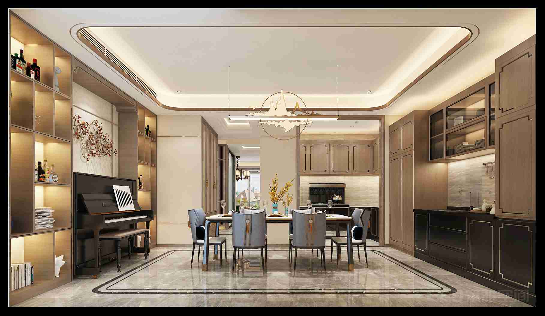 凸顯儀式感和尊貴感的超長(zhǎng)雙橫廳空間,奢華的尺度是本案最為重要的空間亮點(diǎn)。捕捉到這個(gè)優(yōu)勢(shì),設(shè)計(jì)師強(qiáng)調(diào)中式審美特點(diǎn)之一:對(duì)稱性。以過道為中軸,客廳、辦公區(qū)、餐廳、西式吧臺(tái)安然落座,確保整體視野廣闊,空間方寸毫不浪費(fèi)且功能極為融合。