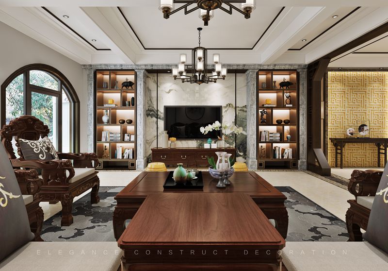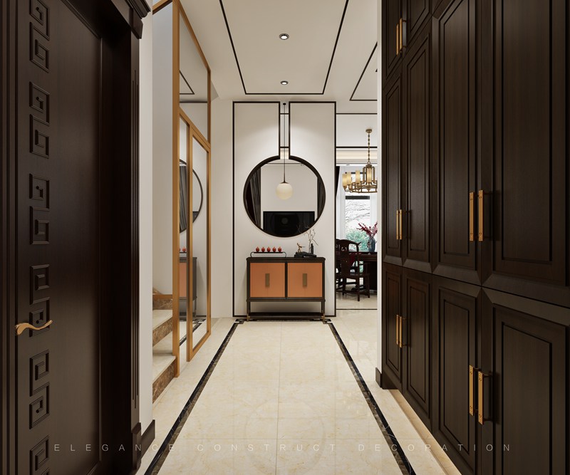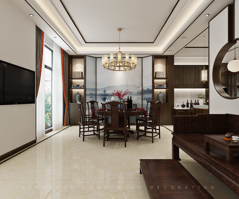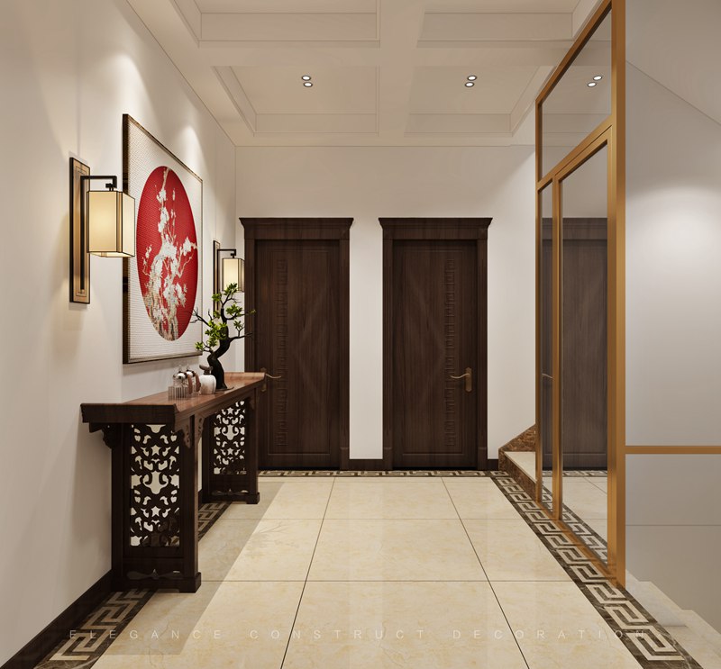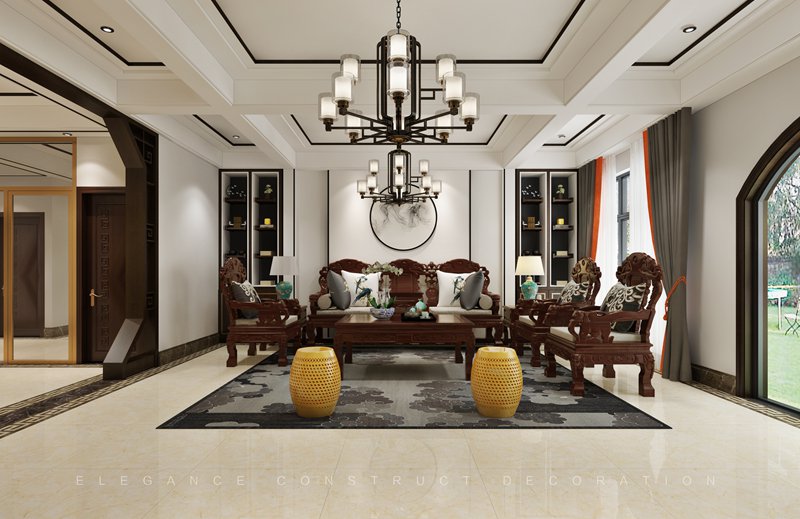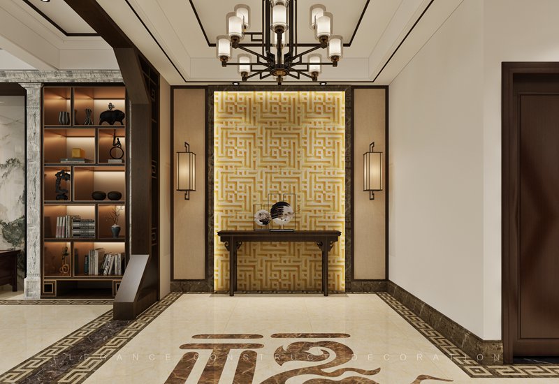 本案一層以客廳為主,外陽(yáng)臺(tái)封為室內(nèi)部分,設(shè)計(jì)造型吊頂隱藏為重組空間而裸漏出來(lái)的梁。通過(guò)重組,實(shí)現(xiàn)大空間客廳,擺放花梨木家具套件。電梯出口地面設(shè)計(jì)福字,寓意開(kāi)門納福。