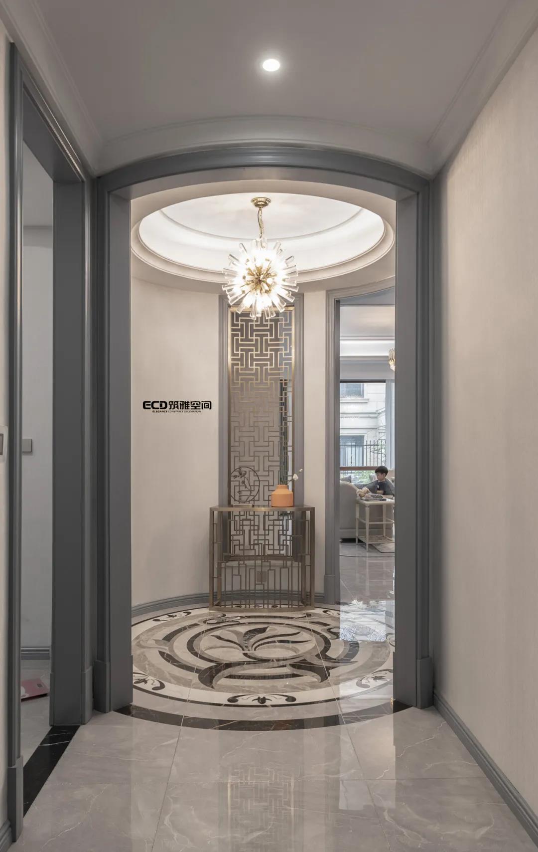 設(shè)計(jì)師巧妙的設(shè)計(jì)了圓形的門廳效果,化解了進(jìn)門直對(duì)樓梯的問題,增加了門廳屏風(fēng),地面運(yùn)用郁金香花的理石圖案與頂部墻面相呼應(yīng),預(yù)示著像花一樣的幸福生活從這里開始。