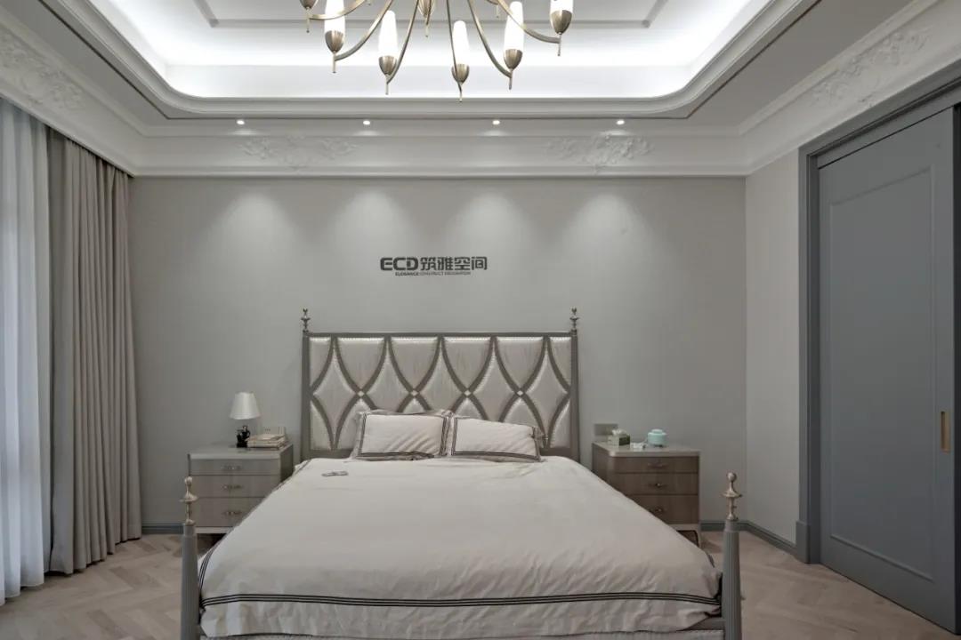 藍(lán)灰色木制的溫潤與淺灰色柔軟床品,同色系不同材質(zhì)的呼應(yīng),在空間里編織輕盈舒緩的氣氛。大面積的落地玻璃窗顯得干凈透亮,在陽光的參與下,更顯溫暖,細(xì)膩的法式小線條,大氣中帶著精致,充分展現(xiàn)了主人的不俗品味與空間的優(yōu)雅氣質(zhì)。