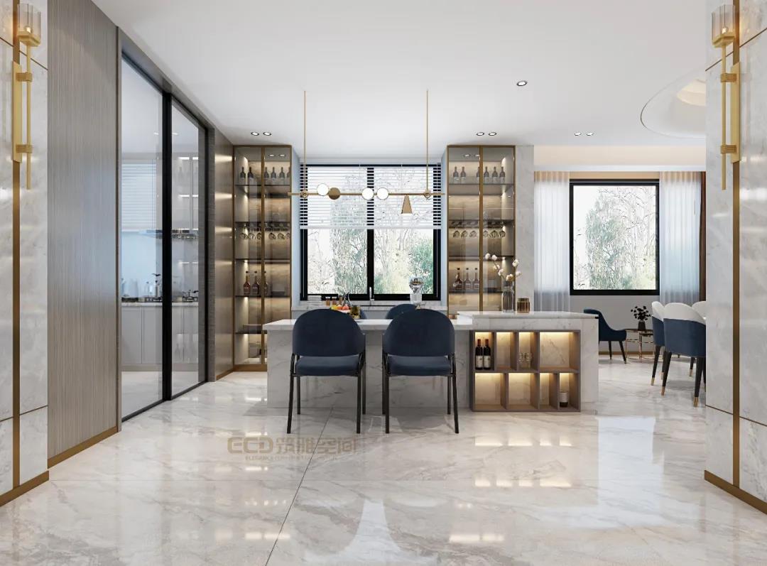 餐廳的通透性、采光極好,家居的選用也備顯質感、高級、低調而奢華。中餐廳與西餐廳空間連成一道簡潔的線條,島臺與西餐餐桌相連,整潔、實用無雜亂,令人舒心與舒適。