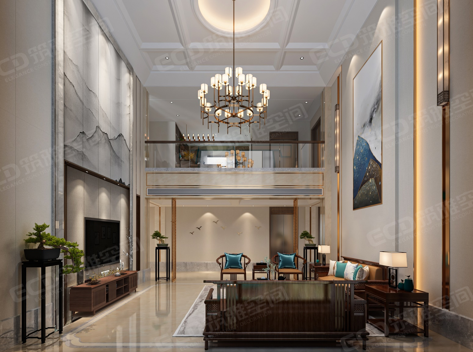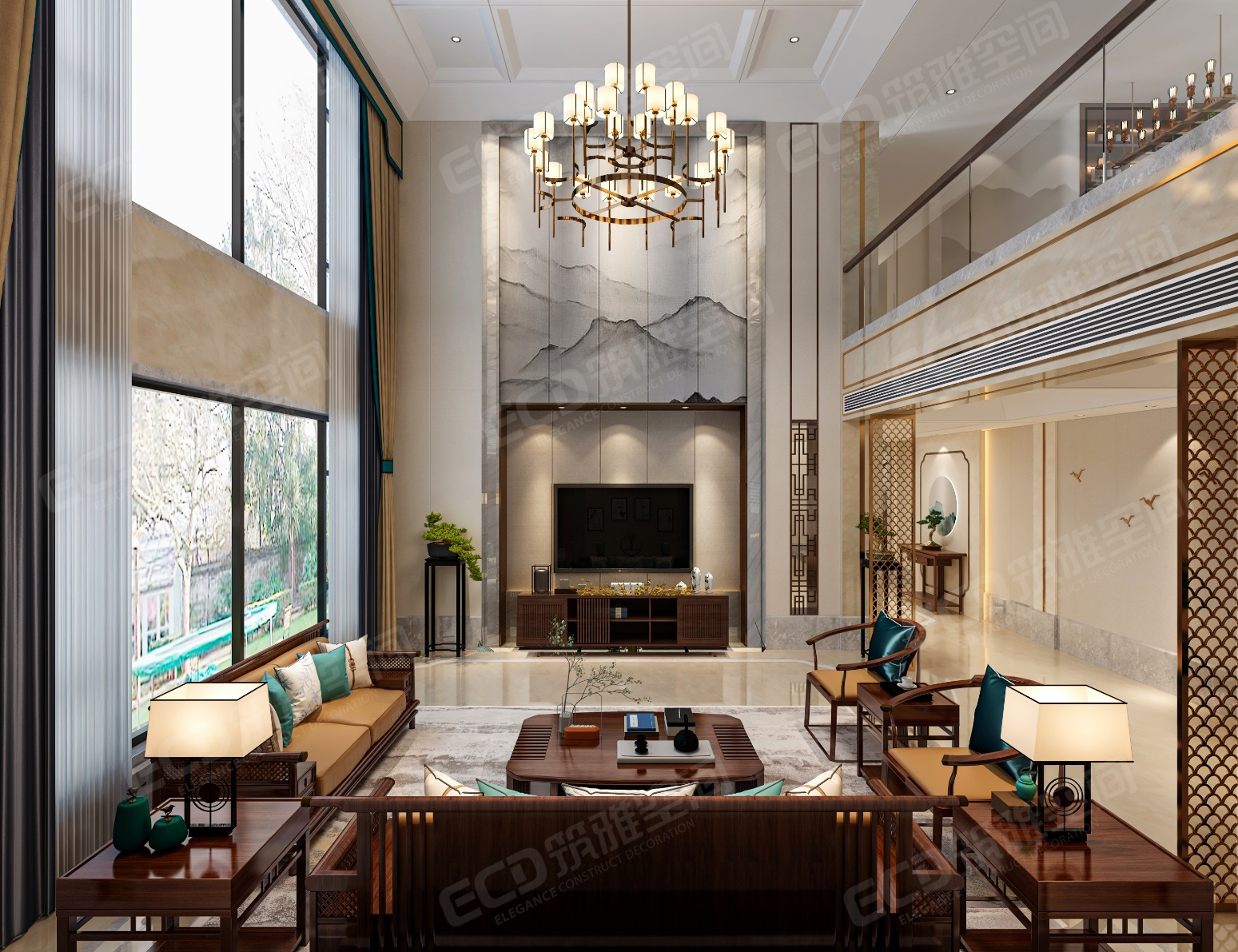 挑空客廳的設(shè)計讓整個空間顯得非常大氣和敞亮。一幅山水氤氳的背景墻,和地毯的元素相互融合,表現(xiàn)出傳統(tǒng)空間的自然氛圍。大面積的窗戶增加了空間的通透度,使空間更加的溫馨和舒適。展現(xiàn)出空間主人追求自然的生活態(tài)度。