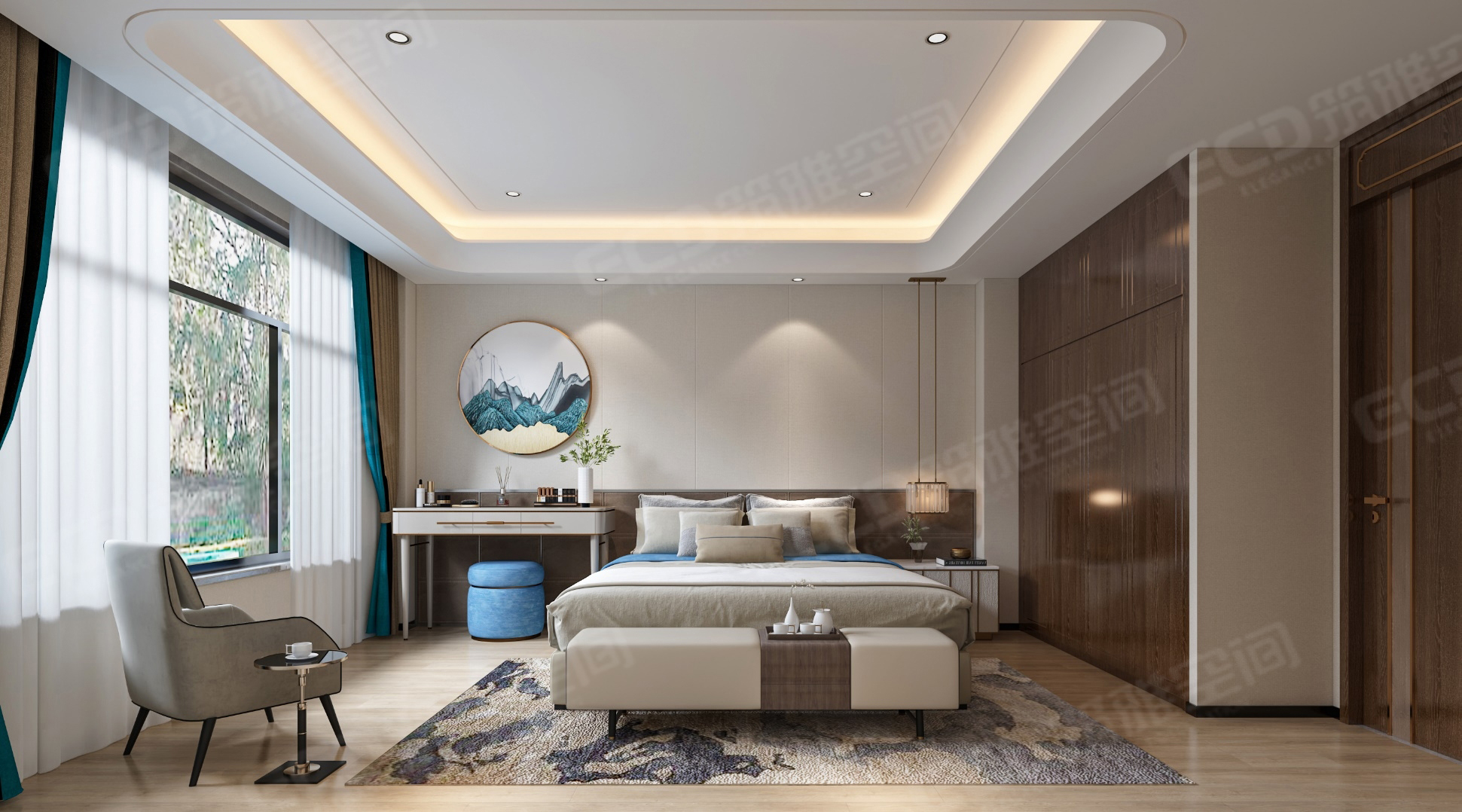 返璞歸真便是中式臥室的真諦,鎏金的風(fēng)景畫靜靜地停留在深藍(lán)的頁面上,床頭柜、紡布燈飾、木色調(diào)賦予了空間韻味流轉(zhuǎn)的“本能”。