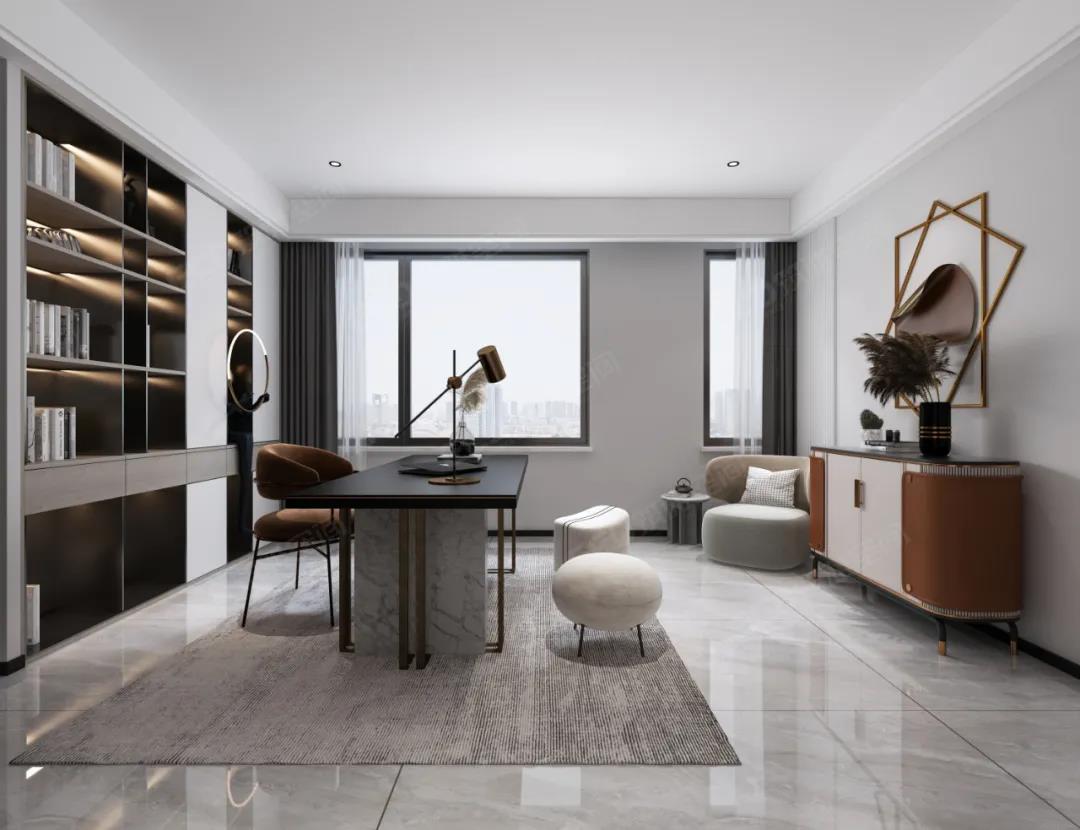 陽(yáng)光透過窗戶,灑在書的篇章之上,書房就是心靈滌蕩的地方。書房空間色彩的選用延續(xù)了大地色系的主色調(diào),配以金屬質(zhì)感的燈飾、配飾,穩(wěn)重、大氣且得體,現(xiàn)代感十足。