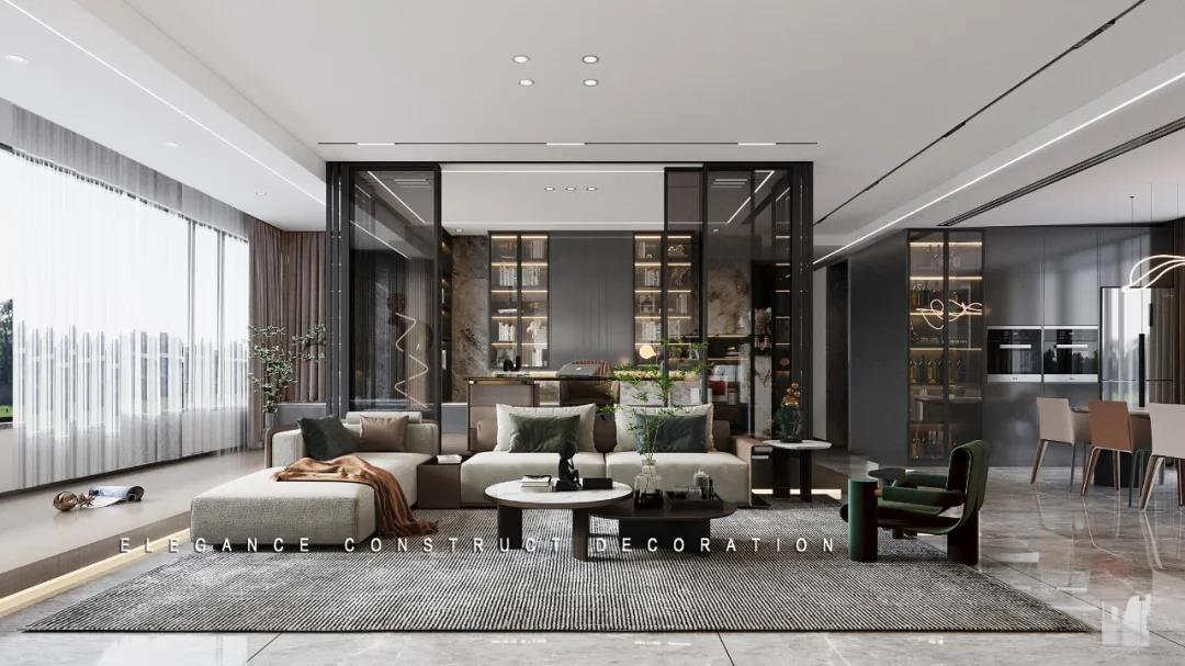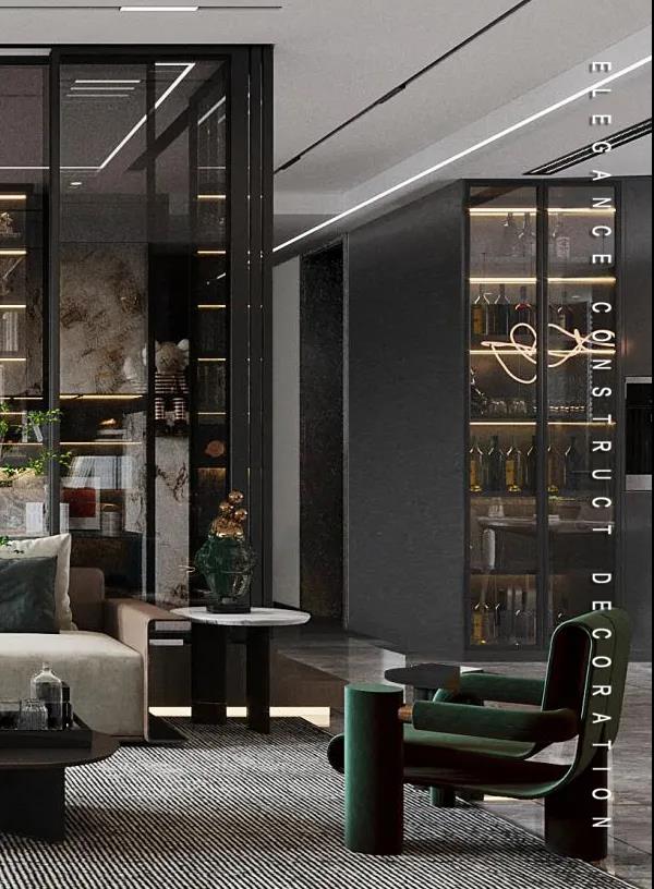 灰色和白色客廳的主角,墨綠色座椅的加入,融入一份生命和延續(xù)感。抬高的書房空間設(shè)計(jì),提高了空間的層次,流暢的布局及舒適的尺度,為日常的交流互動(dòng)提供恰到好處的生活場(chǎng)景。