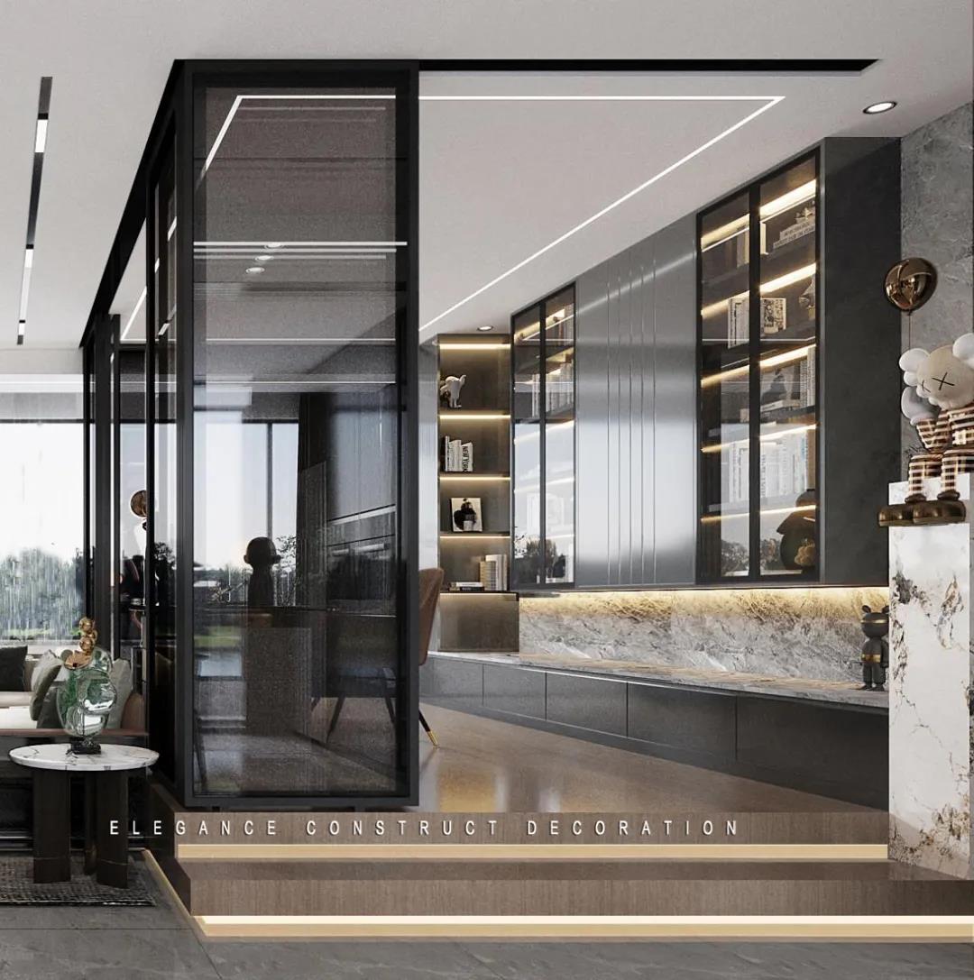 在設(shè)計(jì)時(shí),王老師根據(jù)各個(gè)區(qū)間的可能性,對(duì)空間動(dòng)線進(jìn)行重新規(guī)劃,追求一種居住舒適度與生活藝術(shù)的合理表達(dá)。公共區(qū)域圍繞玄關(guān)-餐廳-廚房-客廳-書房進(jìn)行展開,采用開放式的設(shè)計(jì)布局,增強(qiáng)空間的流動(dòng)性,打造出讓人一目了然的流動(dòng)空間。