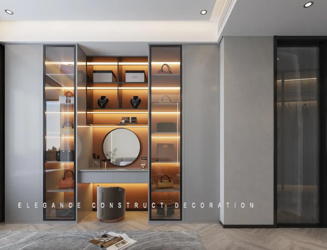 在靠墻的一側(cè),為女主人貼心設(shè)立了專屬的小空間,將心愛的包包與飾品擺設(shè)在這里,為自己畫一個(gè)美美的妝,感受每一個(gè)瞬間滿滿的幸福。