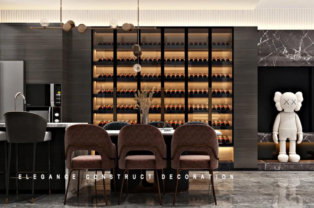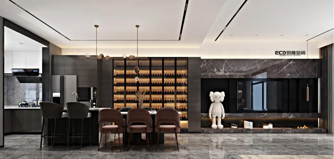 大面積的酒柜彰顯業(yè)主精致的品味,安靜的日子里,小酌一杯珍藏美酒,享受溫酒入喉,品味愜意人生。
