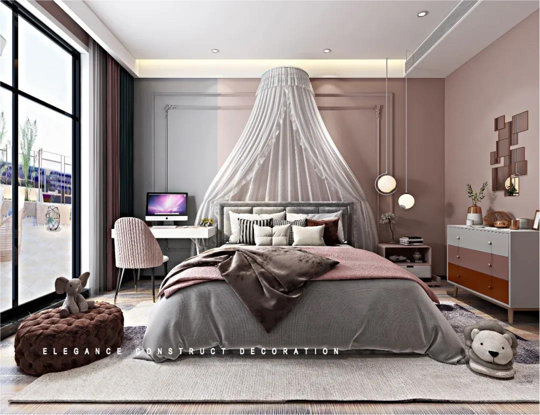 粉色的空間傳達(dá)出小女孩可愛甜蜜的信號(hào),低飽和度的色彩充滿神秘與優(yōu)雅,夢幻的紗幔和布藝窗簾,將整個(gè)空間的色彩基調(diào)呈現(xiàn),絲柔表面,柔軟的床品滿是香甜,既豐潤了空間的層次,又滿足了女孩的公主夢。