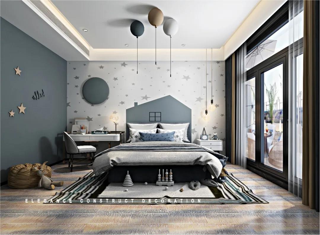 小男孩總是對世界充滿著無限的好奇與想象,臥室墻面以藍(lán)灰色打底,純凈而夢幻;灰色的床鋪又讓空間顯得足夠靜謐和安然。平時(shí)在這里可以和小伙伴們自由的讀書、玩耍,滿足童年時(shí)期的幻想和想象。