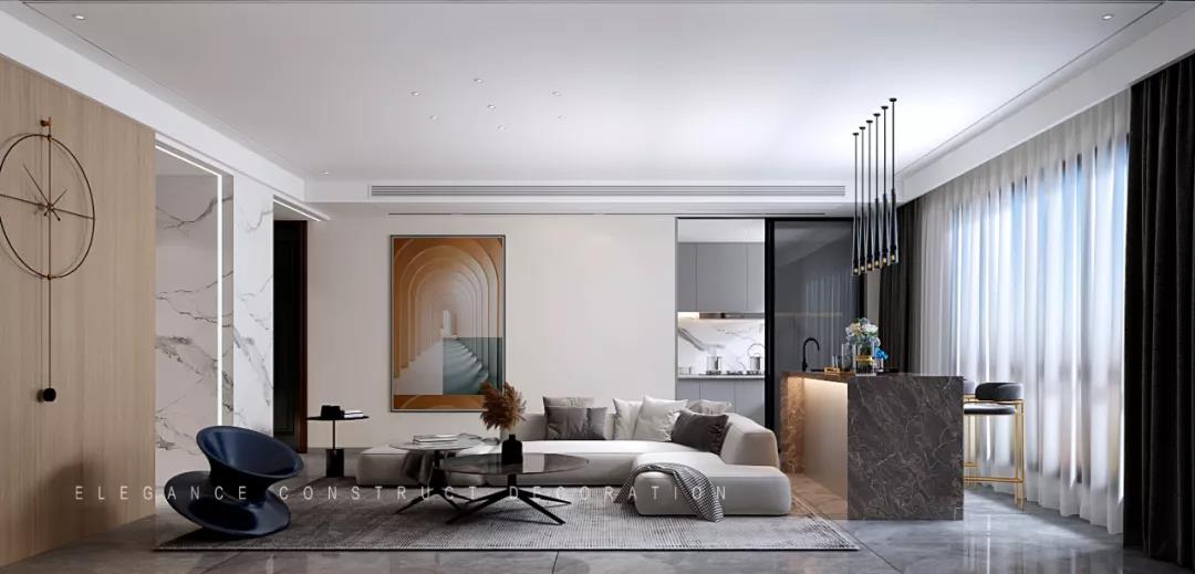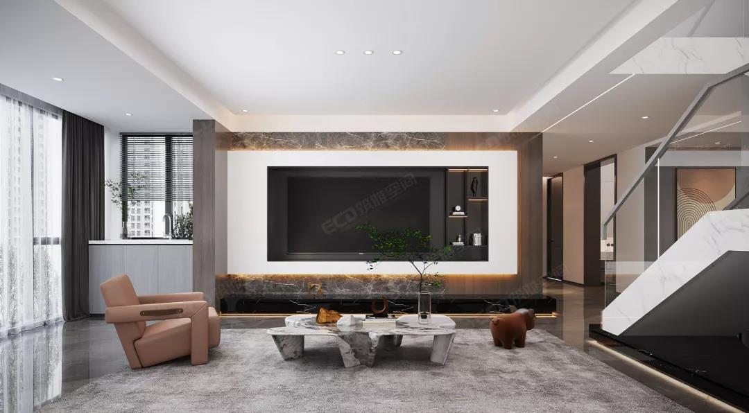 客廳,將都市優(yōu)雅的格調(diào)精煉為流暢的空間線條,靈動的橘色、淡雅的灰色、沉謐的黑色等色彩的運用,激蕩著客廳空間的鮮活氣場。