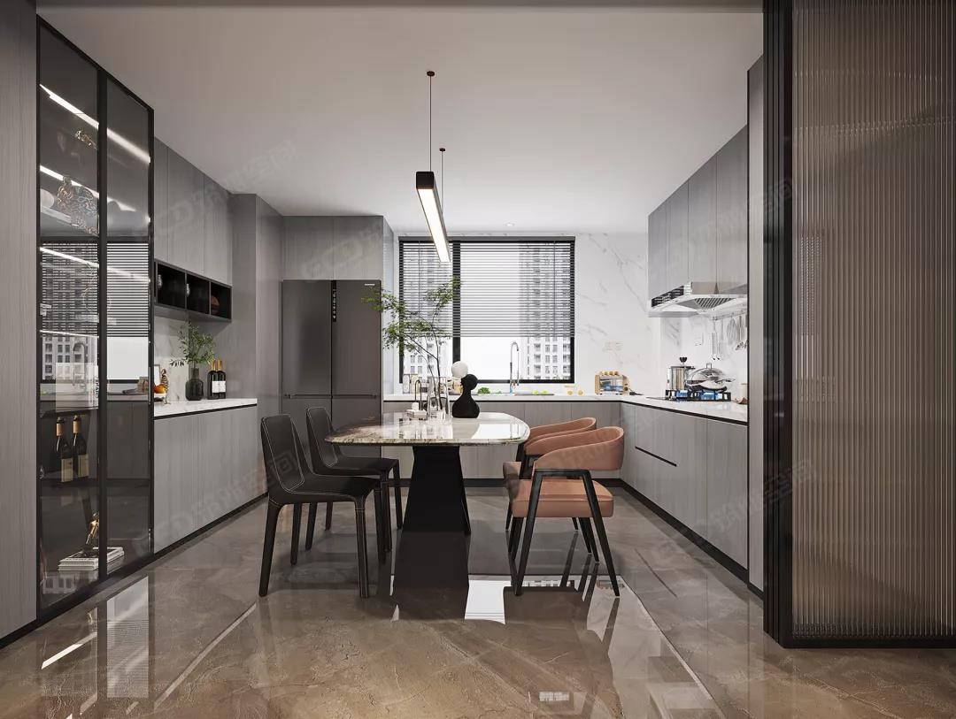 餐廳依偎著廚房,簡練的線條托起華美的肌理,色調(diào)與材質(zhì)呈現(xiàn)疊加魅力。另外,隱藏式冰箱、酒柜等具有強大的收納功能,讓空間的功能得到新的補充,更具延伸與通透感。