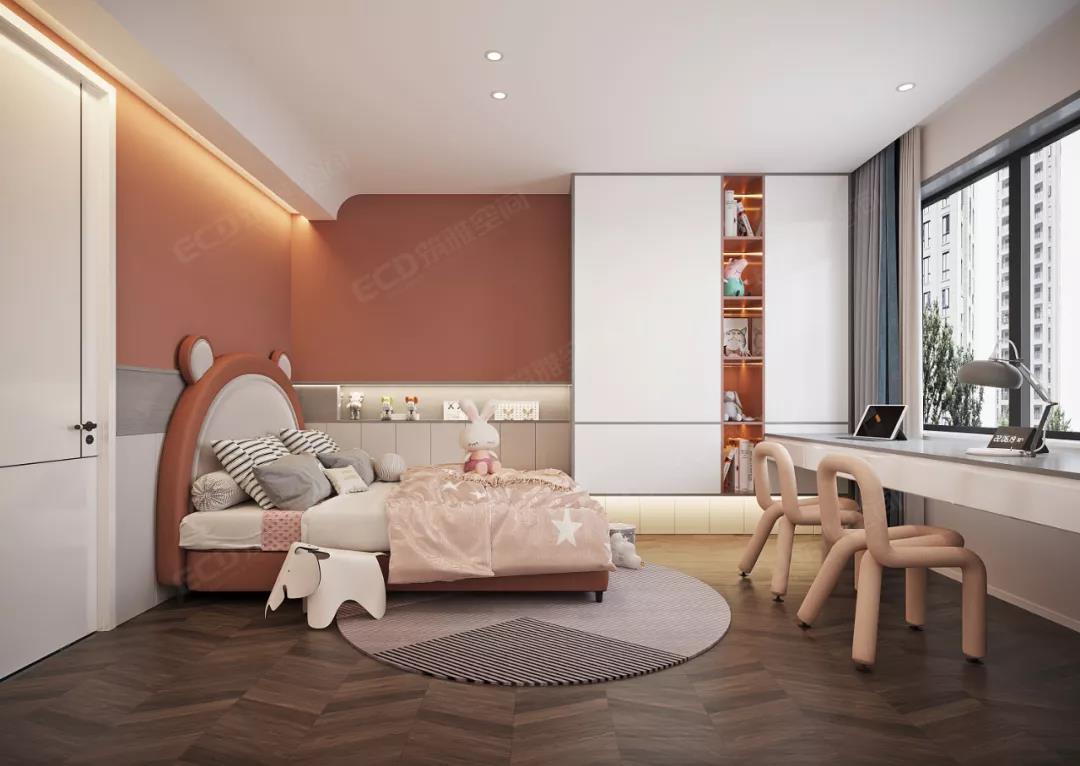 孩子房以明朗色彩呼應活力四射的青春,巧妙地運用床品、擺件、桌椅、玩偶等軟裝配飾,營造空間別致的時尚韻味。通過色彩的深淺對比運用,拉伸空間的層次感,也讓整體空間更加生動、活潑。