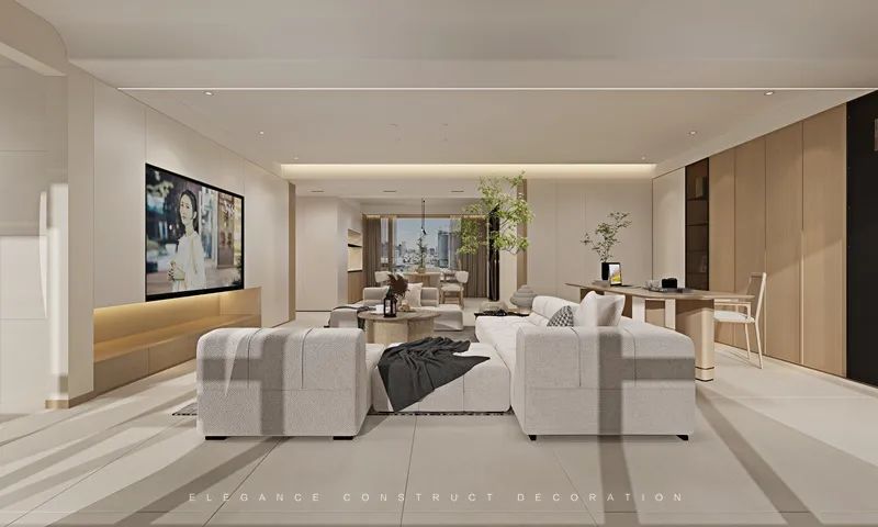 客廳是家居空間的焦點。身處客廳,自在從容,讓生活與時間慢下來。電視背景的處理使得線性與立體感躍然而出,讓空間更具溫雅藝術。淺灰色的沙發,通過大背景的落地窗,在空間中顯得色塊明朗,層次分明。