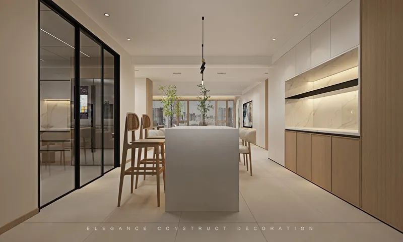 中西餐廚與吧臺整體動線分明,看似簡單,其實是綜合屋主當下生活需求最好的布置方式,大大增加了餐廳空間的視覺感。