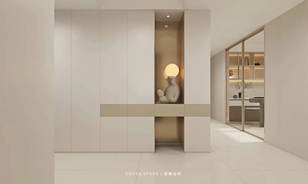 玄關(guān)以暖杏色為基調(diào),嵌入暖光燈帶營(yíng)造溫馨氛圍,平緩歸家時(shí)躁動(dòng)的心緒。