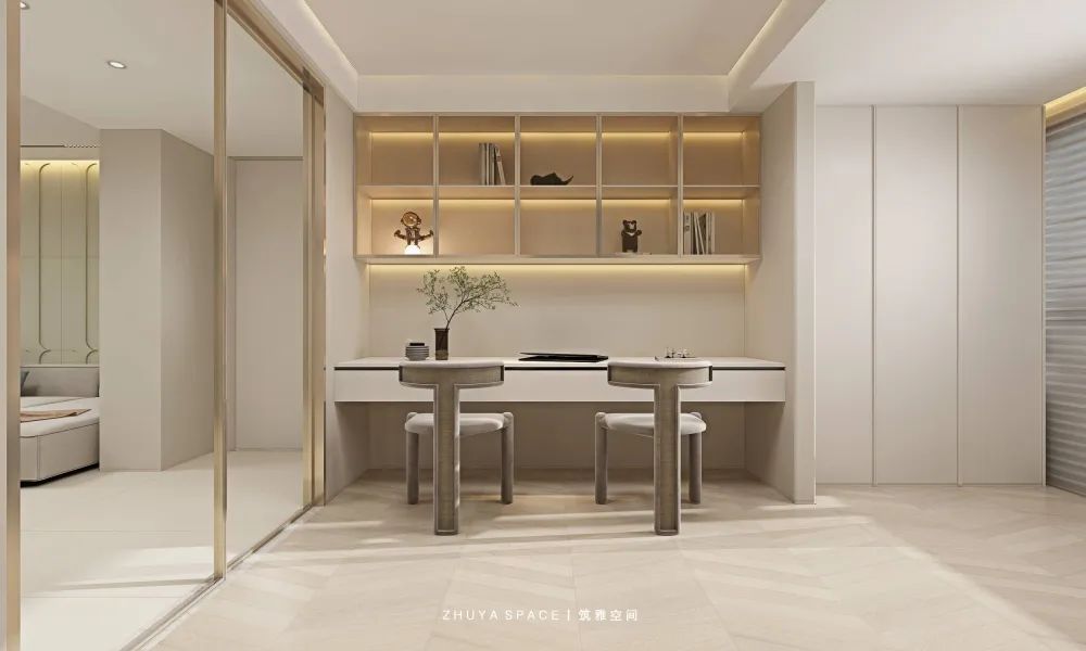 辦公區(qū)采用暖白和客廳相互呼應(yīng)