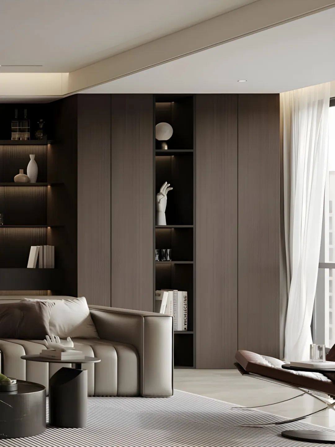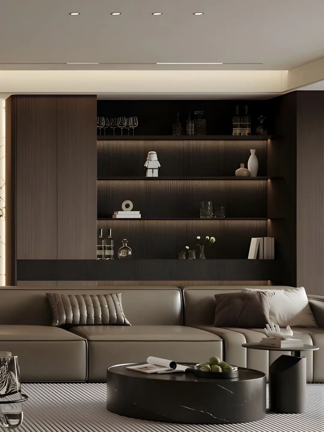 客廳整體色調(diào)以胡桃色和深灰色為主,形成鮮明對(duì)比,營(yíng)造出時(shí)尚而優(yōu)雅的氛圍。家具布局合理,空間開闊,給人以舒適自在的感覺。
