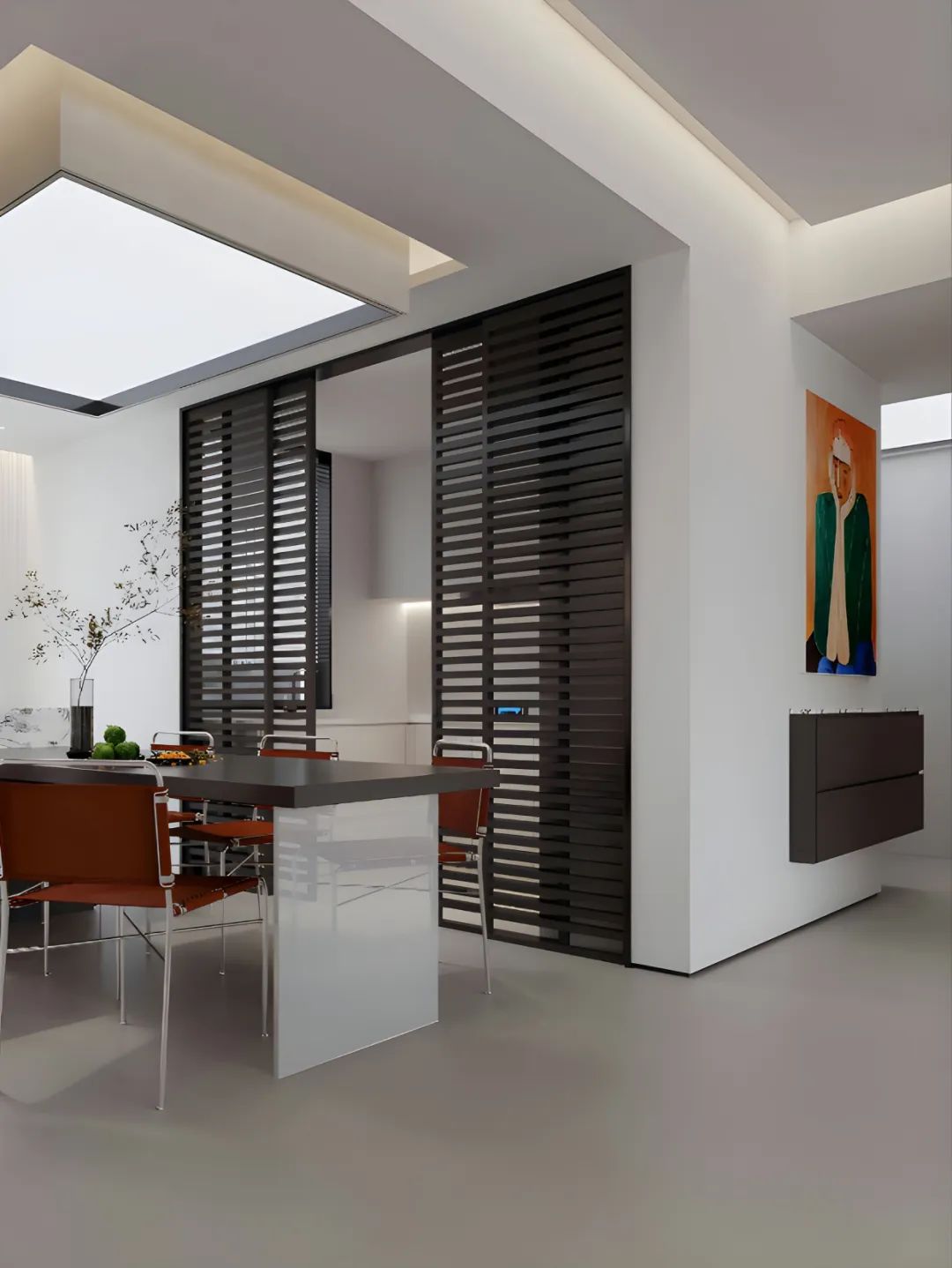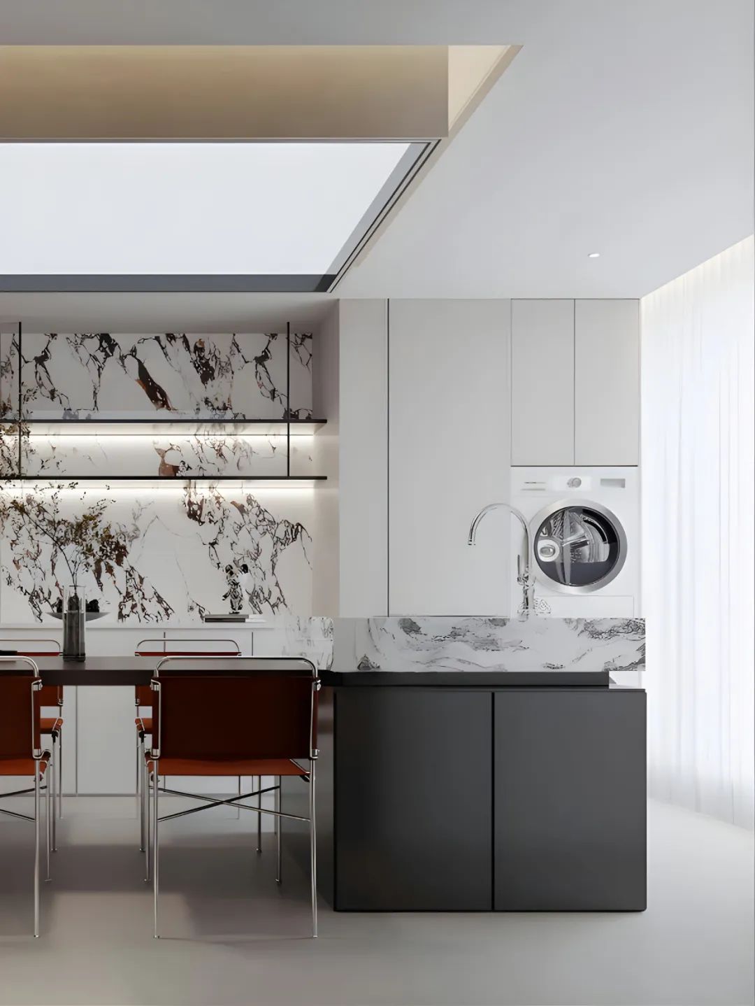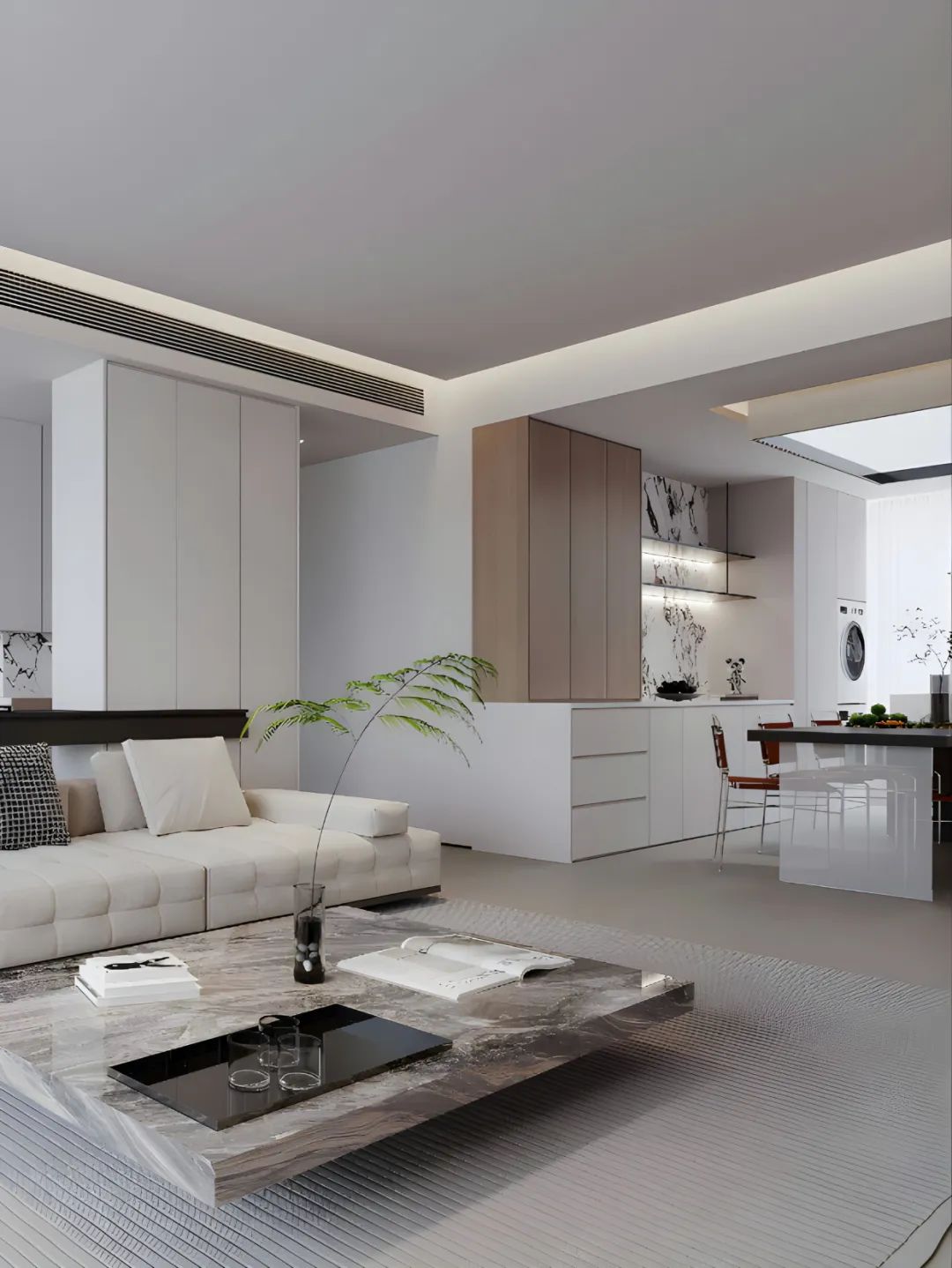 看看這大理石的茶幾,質(zhì)感拉滿,隨手放本書、一杯咖啡,氛圍感這不就有了。開放式廚房和餐廳連在一起,